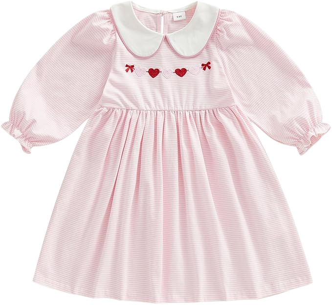 This soft pink gingham dress is full of vintage charm. The tiny heart print paired with the ruffled trim and classic collar makes it feel both playful and timeless. It’s lightweight and comfortable for toddlers, while still feeling special enough for Valentine’s Day festivities.