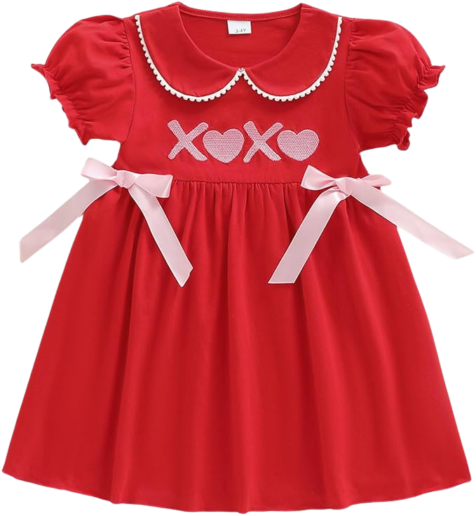 This bright red dress features charming XOXO smocking across the bodice and soft ribbon ties at the waist. It’s comfortable, easy to move in, and full of sweet Valentine’s personality without being over the top.